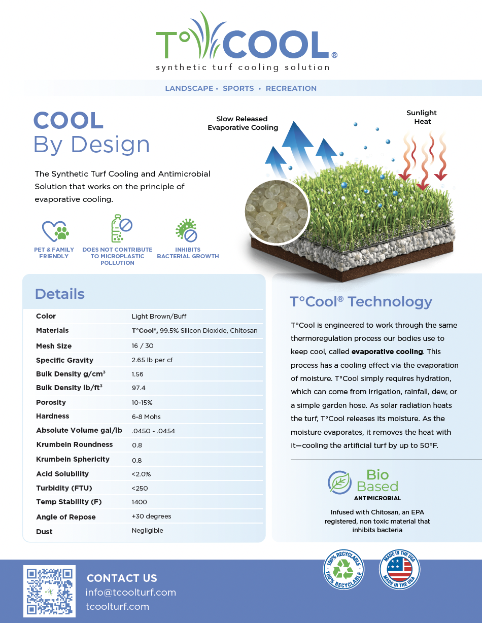 A packet describing what “infill” is, the difference between the available infills within the market, and how the TºCool Innovation is disrupting the Synthetic Turf Industry.